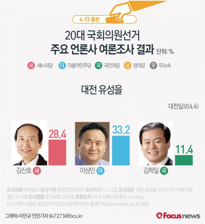 (서울=포커스뉴스) 대전일보가 여론조사기관 충청한길리서치에 의뢰해 4일 발표한 결과에 따르면 대전 유성을에서는 이상민 더불어민주당 의원(33.2%), 김신호 새누리당 후보(28.4%), 김학일 국민의당 후보(11.4%), 이성우 정의당 후보(10.0%), 이경자 노동당 후보(3.1%) 순으로 집계됐다.
