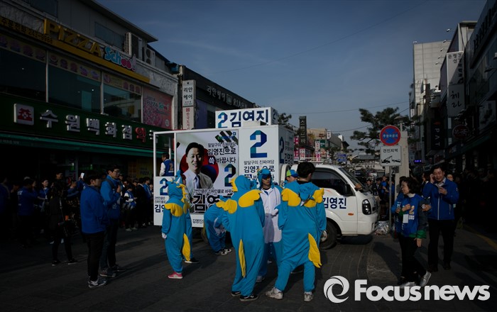 (수원=포커스뉴스) 4일 오후 경기도 수원 팔달문시장 앞에서 열린 더불어민주당 수원지역 합동유세에 인형옷을 입은 중앙당 유세단원들이 잠시 휴식을 취하고 있다.