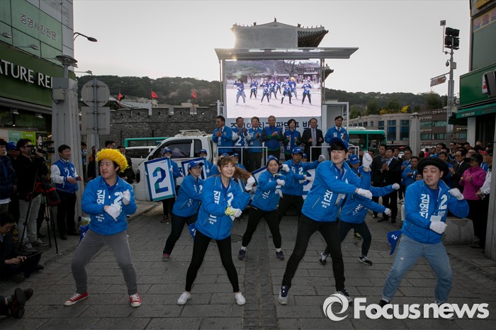 (수원=포커스뉴스) 4일 오후 경기도 수원 팔달문시장 앞에서 열린 더불어민주당 수원지역 합동유세에 참여한 김영진 수원병 후보의 유세단원들이 율동을 선보이고 있다.