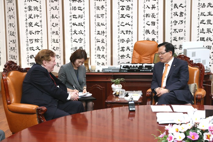 (서울=포커스뉴스) 정의화(오른쪽) 국회의장이 4일 오후 서울 여의도 국회를 방문한 로버트 킹 미국 국무부 북한인권특사와 만나 '북한인권법' 등과 관련 논의를 하고 있다, <사진제공=국회>