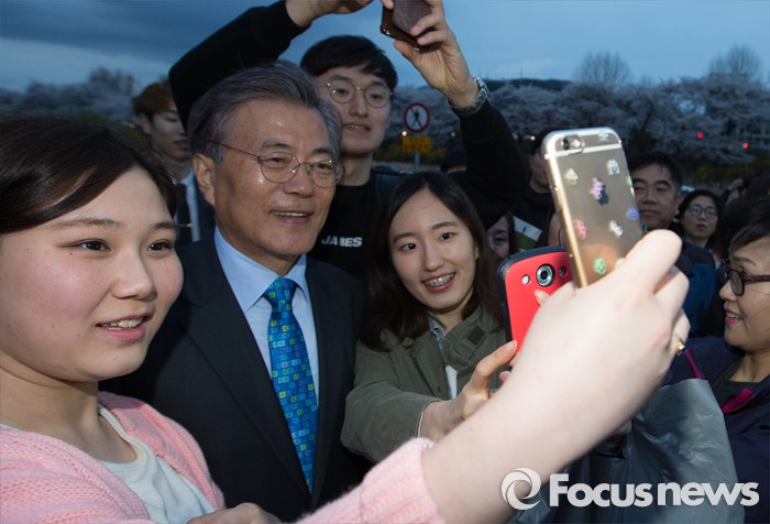 (청주=포커스뉴스) 문재인 더불어민주당 전 대표가 4일 오후 충북 청주 무심천인라인스케이트장에서 시민들과 셀카를 찍고 있다.