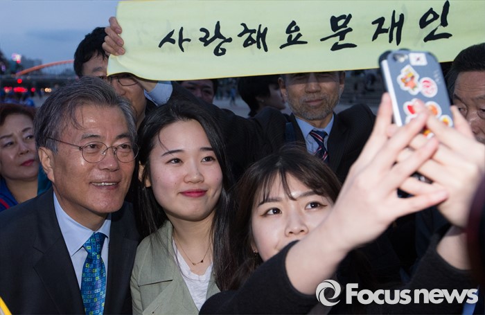 (청주=포커스뉴스) 문재인 더불어민주당 전 대표가 4일 오후 충북 청주 무심천인라인스케이트장에서 시민들과 셀카를 찍고 있다.