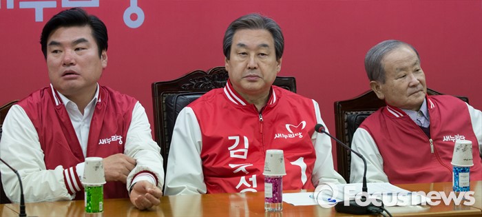 (서울=포커스뉴스) 김무성(가운데) 새누리당 대표가 4일 오후 서울 영등포구 당사에서 열린 중앙선거대책위원회의에 원유철(왼쪽) 원내대표, 강봉균 공동선대위원장과 함께 참석하고 있다.