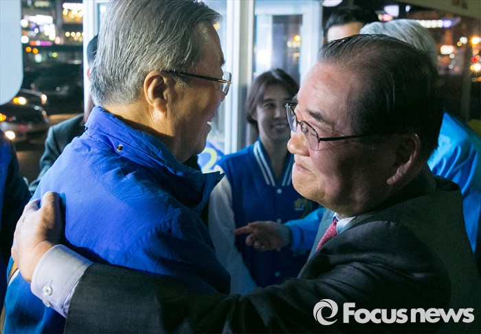 (안양=포커스뉴스) 4일 오후 경기도 지하철 1호선 안양역 앞 광장에서 선거유세를 마친 김종인(왼쪽) 더불어민주당 비대위 대표 겸 선대위원장과 안양 만안구 후보인 이종걸 원내대표의 사촌형 이종찬 전 국정원장이 인사하고 있다.