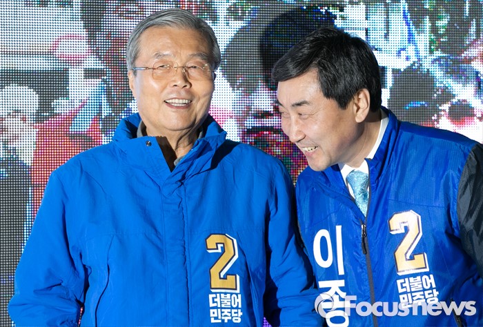 (안양=포커스뉴스) 4일 오후 경기도 지하철 1호선 안양역 앞 광장에서 김종인(왼쪽) 더불어민주당 비대위 대표 겸 선대위원장과 안양만안구 후보인 이종걸 원내대표가 선거유세에 참석해 대화하고 있다.