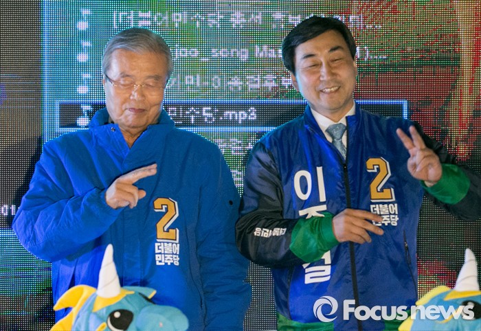 (안양=포커스뉴스) 4일 오후 경기도 지하철 1호선 안양역 앞 광장에 김종인(왼쪽) 더불어민주당 비대위 대표 겸 선대위원장과 안양 만안구 후보인 이종걸 원내대표가 로고송에 맞춰 선거율동을 선보이고 있다.