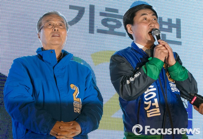 (안양=포커스뉴스) 4일 오후 경기도 지하철 1호선 안양역 앞 광장에서 안양 만안구 후보인 이종걸 더불어민주당 원내대표가 지지를 호소하고 있다. 왼쪽은 김종인 비대위 대표 겸 선대위원장.