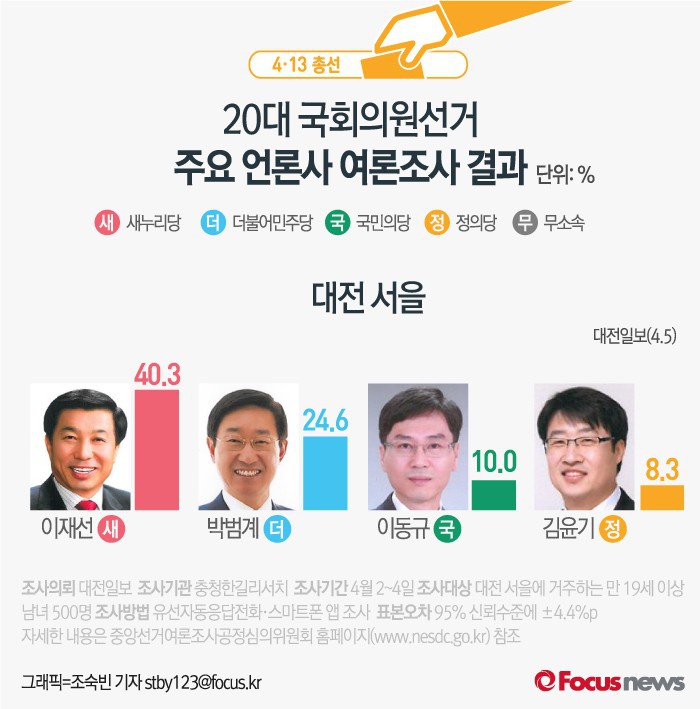 (서울=포커스뉴스) 대전일보가 여론조사기관 충청한길리서치에 의뢰해 5일 발표한 결과에 따르면 대전 서을 후보 지지율은 이재선 후보 40.3%, 더불어민주당 박범계 의원 24.6%, 국민의당 이동규 후보 10% 순이다. 이어 정의당 김윤기 후보가 지지율 8.3%를 기록했다.