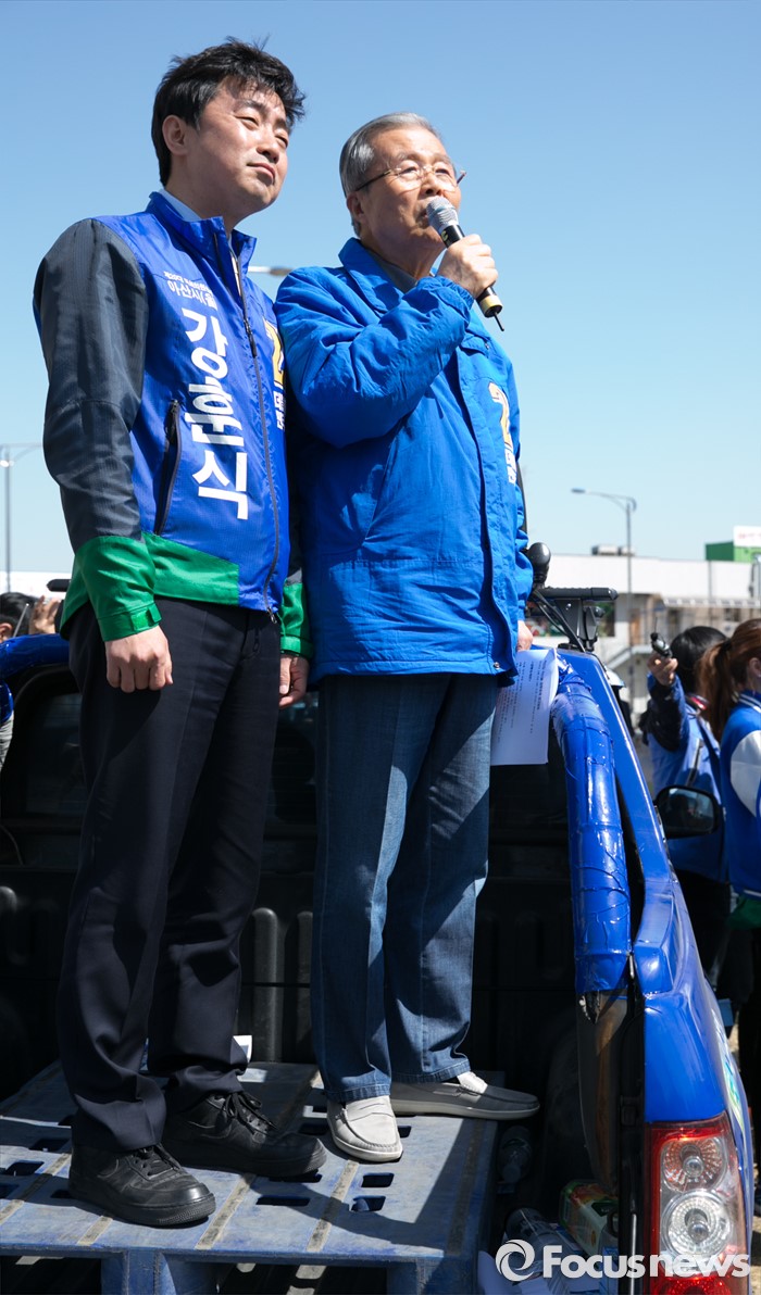 (아산=포커스뉴스) 5일 오전 충남 아산시 배방읍사무소 앞 사거리에서 김종인(오른쪽) 더불어민주당 비대위 대표 겸 선대위원장이 강훈식 아산을 후보의 지지를 호소하고 있다.