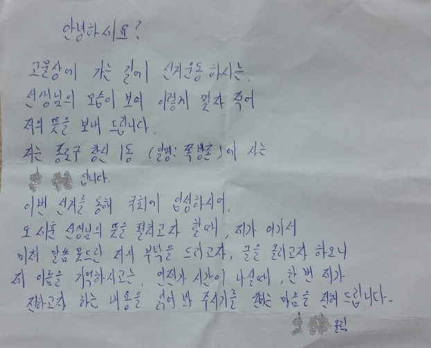이 지지자는 편지에서 "고물상에 가는 길에 선거운동 하시는 선생님의 모습이 보여 이렇게 몇 자 적어 저의 뜻을 보내드린다"며 "이번 선거를 통해 국회에 입성하시라"고 했다.