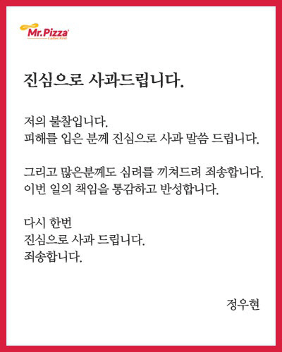 이에 대해 MPK그룹의 주력 브랜드인 미스터피자는 5일 공식 홈페이지에 정 회장 명의로 "진심으로 사과드립니다. 저의 불참입니다. 피해를 입은 분께 진심으로 사과 말씀드립니다"라는 내용의 사과문을 게재했다.
