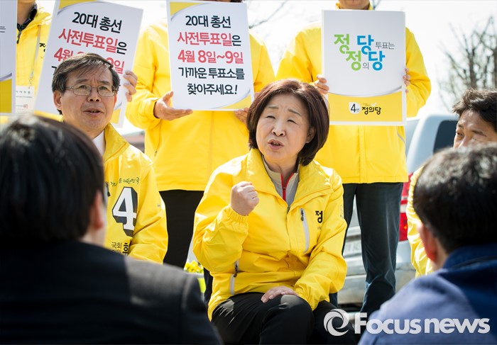 (서울=포커스뉴스) 5일 오전 서울 종로구 성균관대학교 정문 앞에서 윤공규 종로구 후보 지원유세에 나선 심상정 정의당 상임선거대책위원장이 대학생들과 간담회를 하고 있다.