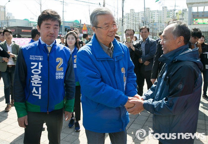 (아산=포커스뉴스) 5일 오전 충남 아산시 배방읍사무소 앞 사거리에서 김종인(가운데) 더불어민주당 비대위 대표 겸 선대위원장과 강훈식 아산을 후보가 유세를 마친 뒤 시민 및 지지자들과 인사하며 지지를 호소하고 있다.