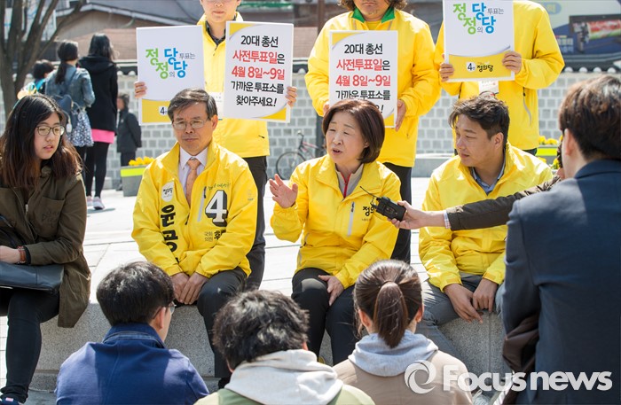 (서울=포커스뉴스) 5일 오전 서울 종로구 성균관대학교 정문 앞에서 윤공규 종로구 후보 지원유세에 나선 심상정 정의당 상임선거대책위원장이 대학생들과 간담회를 하고 있다.