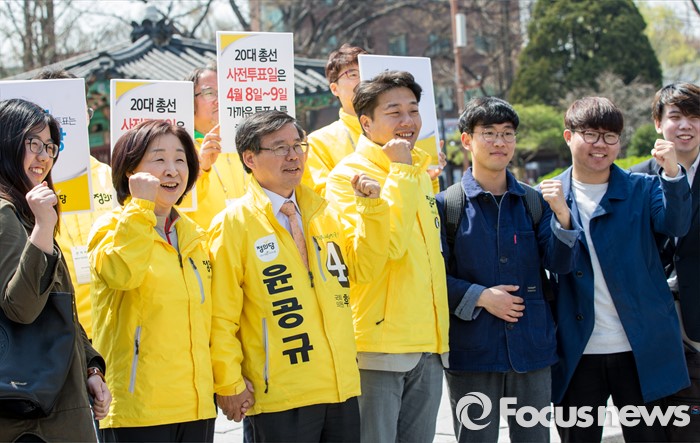 (서울=포커스뉴스) 5일 오전 서울 종로구 성균관대학교 정문 앞에서 윤공규 종로구 후보 지원유세에 나선 심상정(왼쪽 두번째 부터) 정의당 상임선거대책위원장, 윤 후보. 조성주 비례후보가 대학생들과 기념촬영을 갖고 있다.