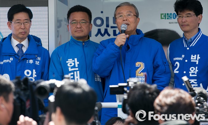 (천안=포커스뉴스) 5일 오전 충남 천안시 신세계백화점 앞에서 열린 더불어민주당 천안지역 합동유세에 참석한 김종인 비대위 대표 겸 선대위원장과 후보들이 지지를 호소하고 있다. 왼쪽부터 양승조 천안병, 한태선 천안갑 후보, 김 대표, 박완주 천안을 후보.