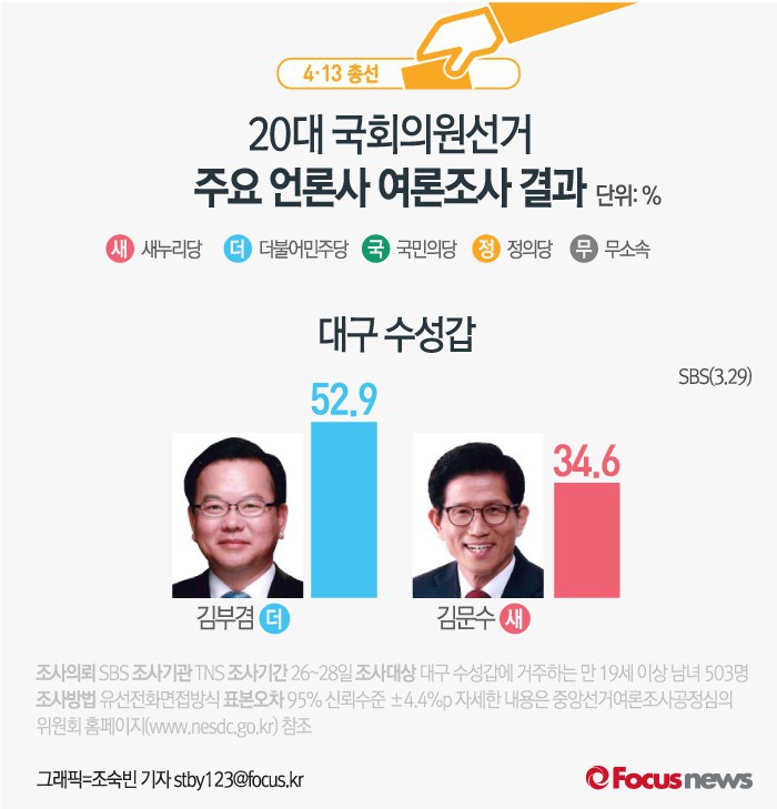 앞서 SBS가 TNS에 의뢰해 지난달 29일 발표한 대구 수성갑 여론에서도 김부겸 후보는 52.9%로 김문수 후보(34.6%)의 지지율을 기록했다.