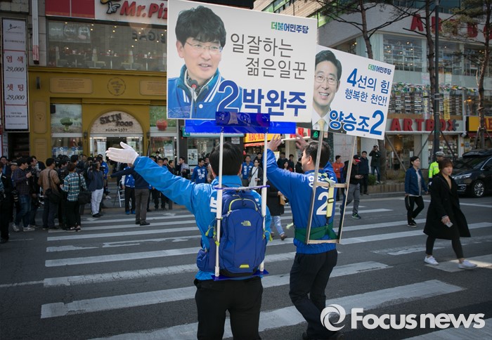 (천안=포커스뉴스) 5일 오전 충남 천안시 신세계백화점 앞에서 열린 더불어민주당 천안지역 합동유세에 참여한 선거운동원들이 지지를 호소하고 있다.