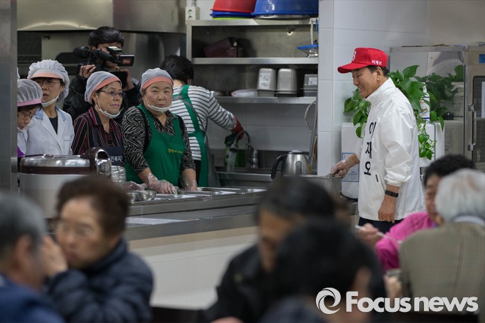 (서울=포커스뉴스) 은평을 무소속 이재오 후보가 5일 오전 서울 은평구 불광노인복지관에서 어르신들에게 점심배식을 하며 유세를 하고 있다.