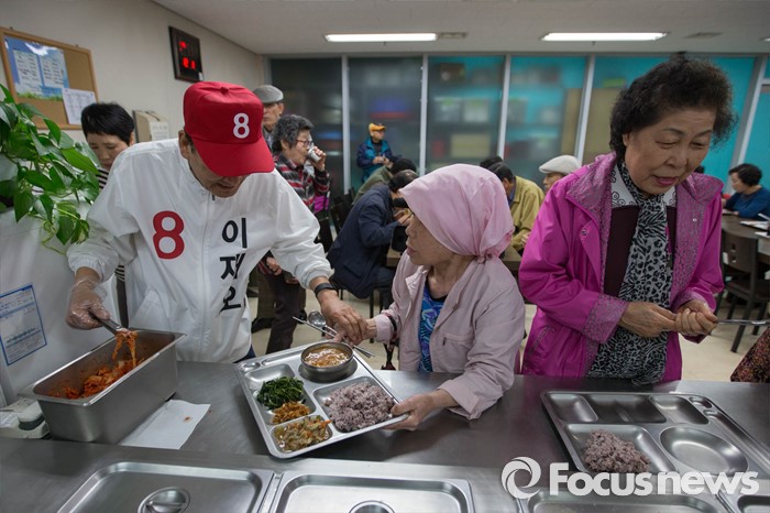 (서울=포커스뉴스) 은평을 무소속 이재오 후보가 5일 오전 서울 은평구 불광노인복지관에서 어르신들에게 점심배식을 하며 유세를 하고 있다.