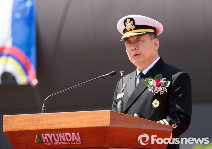 (서울=포커스뉴스) 5일 울산 동구 현대중공업 본사에서 열린 해군의 214급(1,800톤급) 잠수함인 '홍범도함'의 진수식에서 정호섭 참모총장이 축사를 하고 있다. <사진제공=해군>