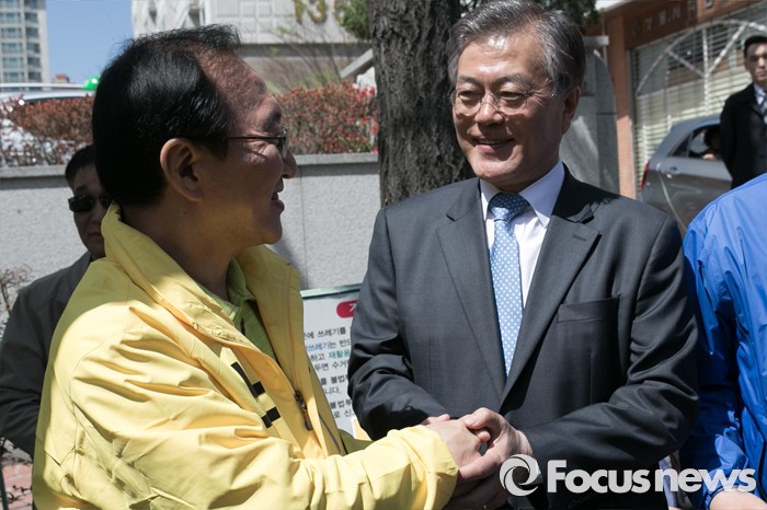 (창원=포커스뉴스) 문재인(오른쪽) 전 더불어민주당 대표가 5일 오후 경남 창원시 성산구 반송시장에서 노회찬(왼쪽) 정의당 창원성산 후보와 악수하고 있다. 노 후보는 창원성산에서 허성무 더불어민주당 후보와 경합에서 승리해, 더민주 · 정의당 단일후보로 출마한다.
