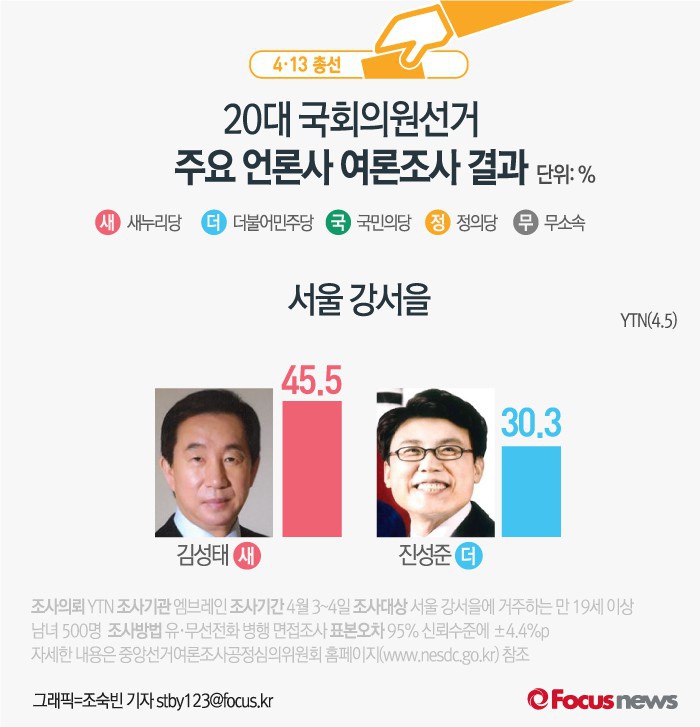 자세한 내용은 중앙선거여론조사공정심의위원회 홈페이지(www.nesdc.go.kr)에서 찾아볼 수 있다.(서울=포커스뉴스) YTN이 여론조사기관 엠브레인에 의뢰해 5일 발표한 결과에 따르면 후보지지도는 김성태 의원(45.5%), 진성준 후보(30.3%) 순인 것으로 조사됐다. 2016.04.05 조숙빈 기자