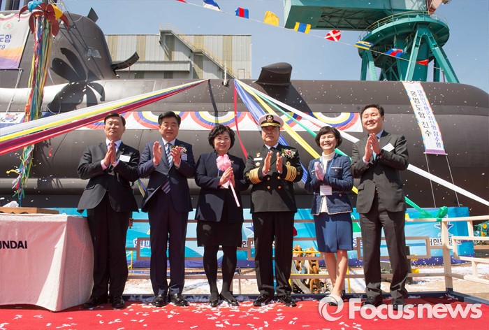 (서울=포커스뉴스) 5일 울산 동구 현대중공업 본사에서 열린 해군의 214급(1,800톤급) 잠수함인 '홍범도함'의 진수식에서 정호섭(오른쪽 세번째) 참모총장을 비롯한 참석자들이 기념찰영을 하고 있다. <사진제공=해군>