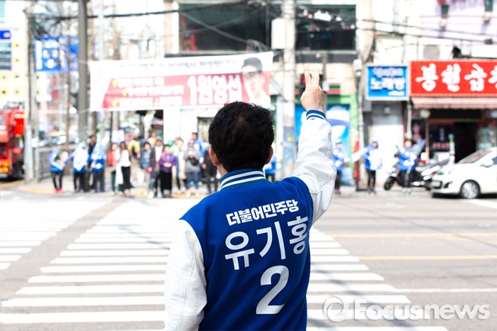 (서울=포커스뉴스) 5일 오후 서울 관악구 서울대입구역 인근에서 유기홍 더불어민주당 관악구갑 후보가 선거유세를 하고 있다.