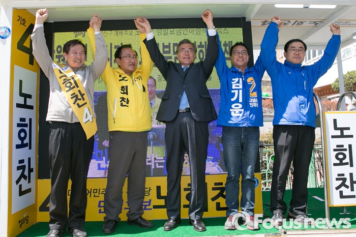 (창원=포커스뉴스) 문재인(가운데) 전 더불어민주당 대표가 5일 오후 경남 창원시 성산구 반송시장 앞에서 노회찬(왼쪽 두번째) 정의당 창원성산 후보 지원유세에 참석해, 노 후보와 손을 들고 있다. 노 후보는 창원성산에서 허성무(오른쪽) 더불어민주당 후보와 경합에서 승리해, 더민주 · 정의당 단일후보로 출마한다.