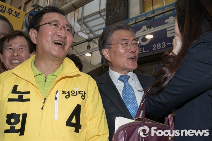 (창원=포커스뉴스) 문재인(가운데) 전 더불어민주당 대표가 5일 오후 경남 창원시 성산구 반송시장에서 노회찬(왼쪽) 정의당 창원성산 후보 지원유세 중, 시민과 대화하고 있다. 노 후보는 창원성산에서 허성무 더불어민주당 후보와 경합에서 승리해, 더민주 · 정의당 단일후보로 출마한다.