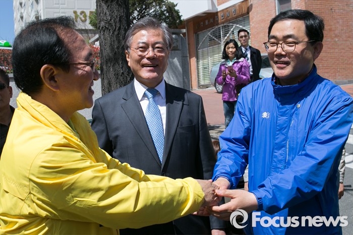 (창원=포커스뉴스) 문재인(가운데) 전 더불어민주당 대표가 5일 오후 경남 창원시 성산구 반송시장에서 노회찬(왼쪽) 정의당 창원성산 후보 지원유세에 참석해, 노 후보와 허성무 전 후보의 악수를 보고 있다. 노 후보는 창원성산에서 허성무 더불어민주당 후보와 경합에서 승리해, 더민주 · 정의당 단일후보로 출마한다.