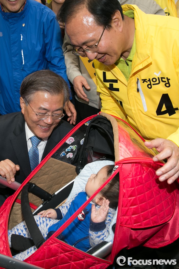 (창원=포커스뉴스) 문재인(왼쪽) 전 더불어민주당 대표가 5일 오후 경남 창원시 성산구 반송시장에서 노회찬(오른쪽) 정의당 창원성산 후보 지원유세 중, 어린이와 기념사진을 찍고 있다. 노 후보는 창원성산에서 허성무 더불어민주당 후보와 경합에서 승리해, 더민주 · 정의당 단일후보로 출마한다.