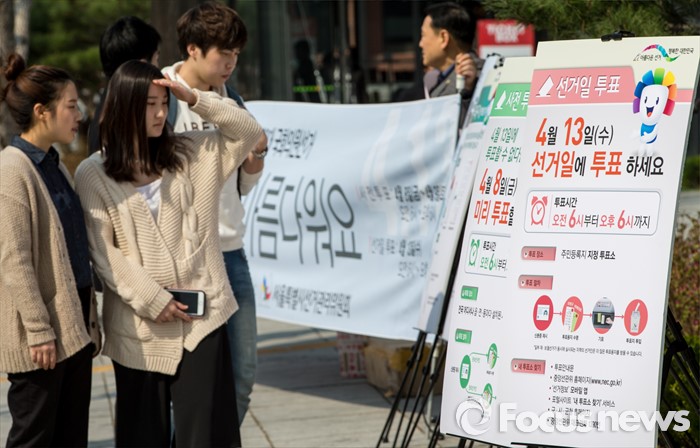 (서울=포커스뉴스) 20대 국회의원선거를 8일 앞둔 5일 오후 서울 종로구 마로니에공원 인근에 설치된 4.13총선 투표참여 홍보자료를 청년 유권자들이 유심히 살펴보고 있다.