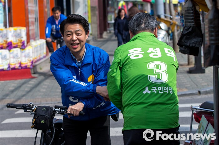 (서울=포커스뉴스) 김영호 더불어민주당 서대문을 후보와 홍성덕 국민의당 서대문을 후보가 5일 오후 서울 서대문구 백련시장 일대에서 선거운동을 하던 중 악수하고 있다.
