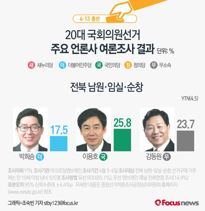 (서울=포커스뉴스) YTN이 여론조사기관 엠브레인에 의뢰해 5일 발표한 결과에 따르면 전북 남원·임실·순창에서 후보지지도는 더민주 박희승 후보(17.5%), 국민의당 이용호 후보(25.8%), 무소속 강동원 후보(23.7%) 순인 것으로 조사됐다.