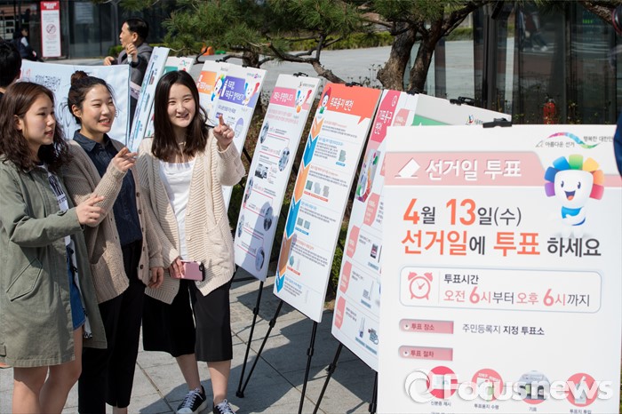 (서울=포커스뉴스) 20대 국회의원선거를 8일 앞둔 5일 오후 서울 종로구 마로니에공원 인근에 설치된 4.13총선 투표참여 홍보자료를 청년 유권자들이 유심히 살펴보고 있다.