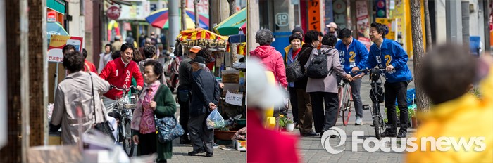 (서울=포커스뉴스) 정두언(왼쪽) 새누리당 서대문을 후보와 김영호 더불어민주당 서대문을 후보가 5일 오후 서울 서대문구 백련시장 일대에서 자전거를 타고 주민들을 만나며 한 표를 호소 하고 있다.