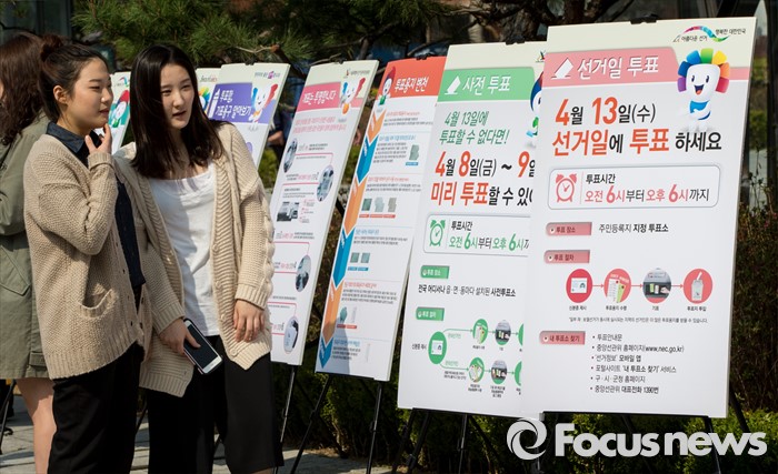 (서울=포커스뉴스) 20대 국회의원선거를 8일 앞둔 5일 오후 서울 종로구 마로니에공원 인근에 설치된 4.13총선 투표참여 홍보자료를 청년 유권자들이 유심히 살펴보고 있다.