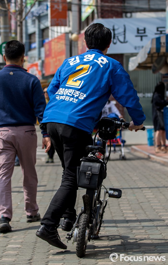 (서울=포커스뉴스) 김영호 더불어민주당 서대문을 후보가 5일 오후 서울 서대문구 백련시장 일대에서 자전거를 타고 주민들을 만나며 한 표를 호소 하고 있다.