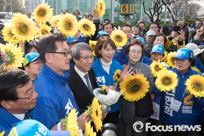 (서울=포커스뉴스) 20대 총선에 출마한 전현희 더불어민주당 강남을 후보가 5일 오후 서울 수서역 인근에서 전 후보의 고문으로 활동하기로 한 정운찬 전 국무총리와 함께 유권자들에게 지지를 호소하고 있다.