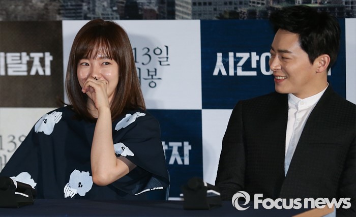 (서울=포커스뉴스) 5일 오후 서울 성동구 왕십리 CGV에서 열린 영화 '시간이탈자' 언론시사회에 배우 임수정(왼쪽)과 조정석이 미소를 짓고 있다.