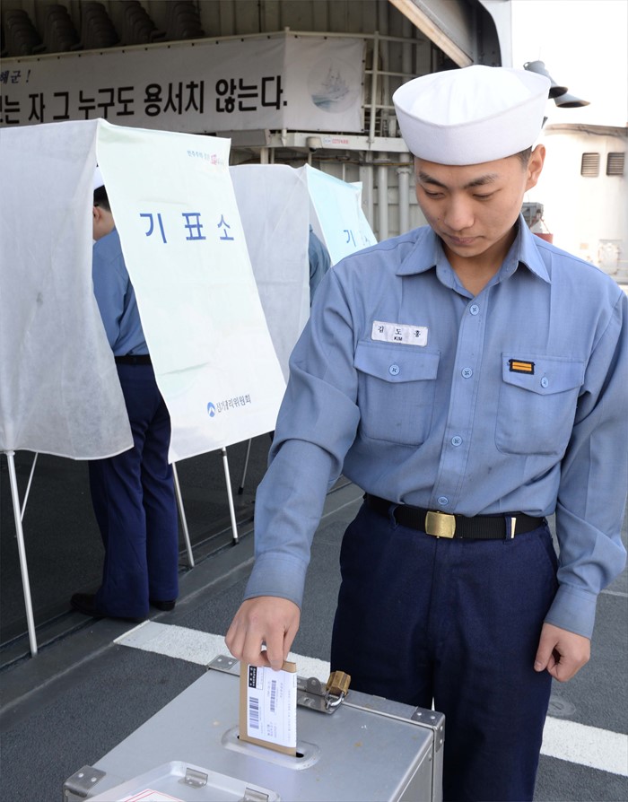 (서울=포커스뉴스) 해군 1함대 광개토대왕함 장병들이 5일 오후 KD-I 광개토대왕함 함미갑판에서 거소투표를 하고 있다. <사진제공=해군>