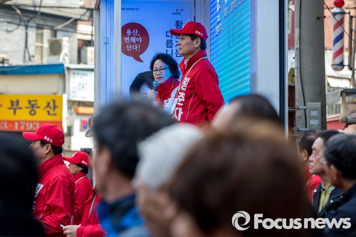 (서울=포커스뉴스) 황춘자 새누리당 용산구 후보가 5일 오후 서울 용산구 이태원동 일대에서 유세를하며 주민들에게 한 표를 호소 하고 있다.
