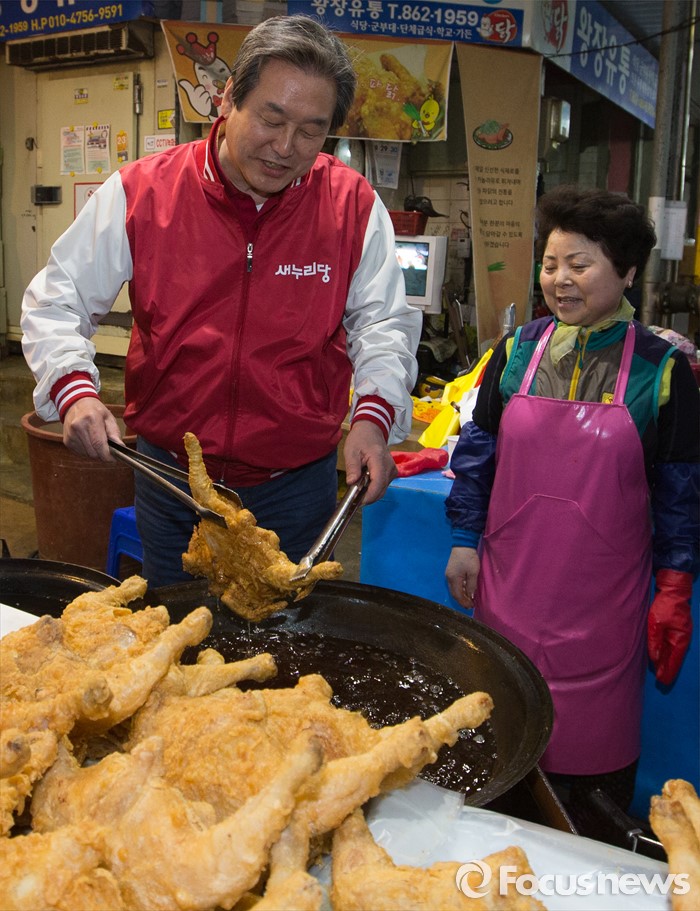 (세종=포커스뉴스) 김무성 새누리당 대표가 5일 오후 세종시 조치원읍 세종전통시장을 방문, 통닭을 튀기고 있다.