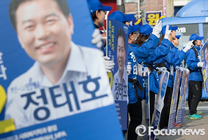(서울=포커스뉴스) 5일 오후 서울 관악구 삼성동시장 앞에서 정태호 더불어민주당 관악구을 후보 선거운동원들이 지원유세를 하고 있다.