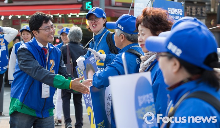 (서울=포커스뉴스) 5일 오후 서울 관악구 삼성동시장 앞에서 더컸유세단 김광진 의원이 정태호 더불어민주당 관악구을 후보 지원유세를 하고 있다.