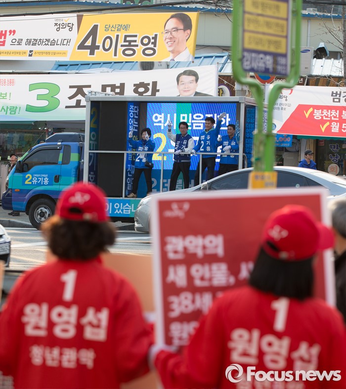 (서울=포커스뉴스) 5일 오후 서울 관악프라자센터 앞에서 유기홍 더불어민주당 관악구갑 후보가 유세차량에 탑승해 지지를 호소하고 있다. 아래는 원영섭 새누리당 관악구갑 후보 선거운동원들.