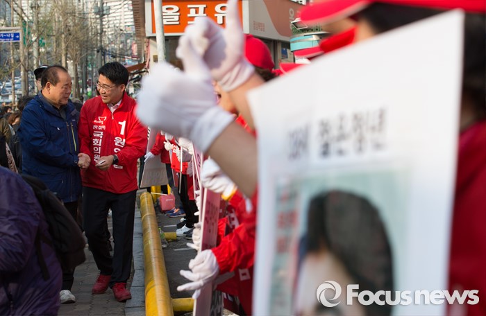 (서울=포커스뉴스) 5일 오후 서울 관악프라자센터 앞에서 원영섭 새누리당 관악구갑 후보가 선거유세를 하고 있다.