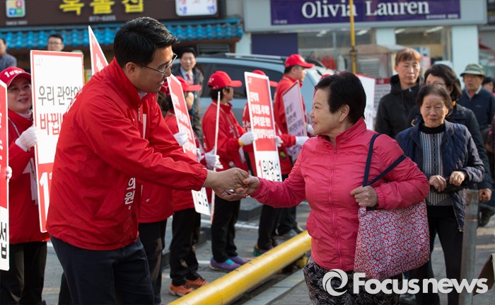 (서울=포커스뉴스) 5일 오후 서울 관악프라자센터 앞에서 원영섭 새누리당 관악구갑 후보가 선거유세를 하고 있다.